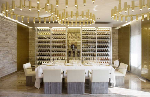 The above pictures of the Gold Restaurant are the "Bistro" located on the main level. This is where we dined in one of the circular banquettes. The food is international Italian — simple, seasonal dishes and the wine we had with dinner was superb. The décor, a kind of midcentury modern with a bling injection. Gold is used everywhere from the golden bamboo bathrooms down to the water-bottle labels.
